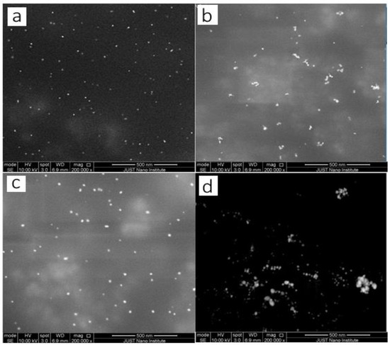 SEM images of the GNPs produced under different conditions. (a) GNPs made in a microreactor with a concentration of HAuCl4 of 0.7 mM and in the presence of PVA (after 900 s). (b) GNPs produced in a microreactor with a concentration of HAuCl4 of 0.7 mM in the presence of PVA (after one year). (c) GNPs prepared with a conventional method with 0.7 mM HAuCl4 in the presence of PVA (after 900 s). (d) GNPs created using the conventional method with a HAuCl4 concentration of 0.7 mM in the absence of PVA (after one year).