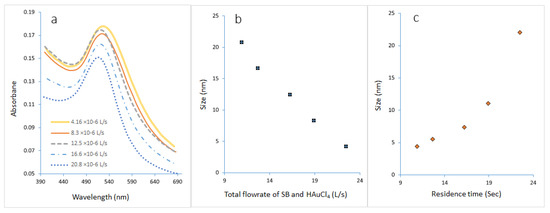 (a) The UV-vis spectra of GNP samples prepared in a microreactor at various flow rates of (SB and HAuCl4). (b) The impact of flow rate on the size of the final particle. (c) The impact of residence time on particle size. (Cons of SC, SB, and HAuCl4 = 0.1 mM, T = 308.15 K, volumetric ratio of SB/AuCl4 = 4:10, and pH = 3).