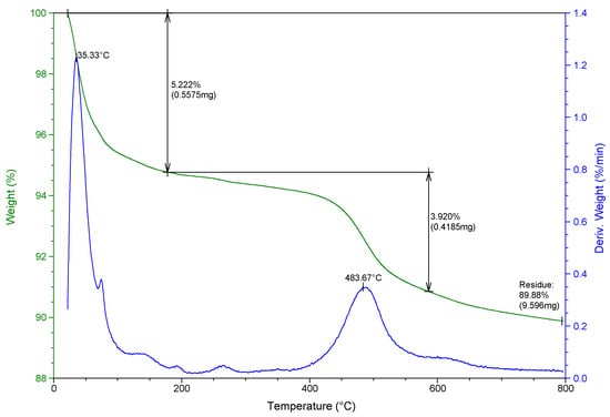 The characterization of the purified and modified clays [] was conducted in an XRD XPert PANalytical Empyrean diffractometer with radiation of Cu Kα (λ = 0.1542 nm) operated at 30 kV and 15 mA. The thermogravimetry analysis (TGA) readings were taken in TGA Q500 V6.7 Build 203 equipment in the temperature range of 20–800 °C at a heating rate of 10 C min−1. The Fourier-transform infrared (FTIR) analysis was performed in Nicolet iS5 Thermo Scientific equipment between 500 and 4000 cm−1 in transmittance mode. The scanning electronic microscopy (SEM) analysis was performed in an FEI Quanta 250 microscope (Thermo Fisher Scientific, Waltham, MA, USA).