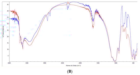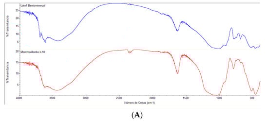 The similarity in the appearance of the FTIR spectra of the raw bentonite clay and the Sigma Aldrich montmorillonite standard means that the raw bentonite clay contents are mainly montmorillonite. Moreover, six bands were detected that correspond to 3614 and 3418 cm−1 (OH and the hydration stretching), 1641 cm−1 (OH and the hydration flexion), 1051 cm−1 (Si-OH extension in the plane), 542 cm−1 (Si-O flexion), and 460 cm−1 (Al-OH flexion). Otherwise, the evidence that the ionic liquid (1-hexadecyl-3-methylimidazolium bromide) was successfully intercalated is shown by the bands at 2780 cm−1, which depict the stretching of the C-H bond (Figure 4B).