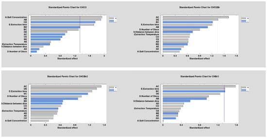 Through the Pareto charts for the four THMs, is possible to see that in all of them, the extraction time factor significantly affects headspace extraction in a direct or combined way. The labeled factors represent the following: factor A is salt concentration; B is the distance between the discs; C is the extraction temperature; D is the number of discs; and E is the extraction time.