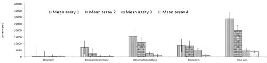 The analytical characteristics are shown in Table 4. The LOD and LOQ were calculated according to the IUPAC rules (LOD = 3 sB/m and LOQ = 10 sB/m) where sB is the standard deviation of blank and m is the slope of regression linear of the calibration curve at low-range concentrations. In general, the method exhibited good performance parameters, considering that these compounds are volatile. Although the injection was manual, taking into consideration the entire procedure, the relative standard deviations, except that for chloroform, were below 10%. The precision could be further improved by automation or by using the internal standard calibration mode.