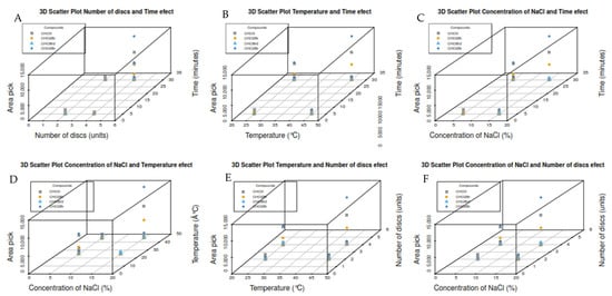 Therefore, 30 min was chosen as the ideal extraction time (Figure 8 and Figure 9A–C). The increasing addition of salt increased the extraction of the target DBP; higher salt concentrations were not necessary based on our experience and that of other authors because excess ionic strength may affect analyte diffusion into the organic phase. For this reason, 15% NaCl was chosen as the salting-out concentration for all subsequent trials using real samples (Figure 8 and Figure 9C,D,F). The use of four discs and a 2 mm distance between them presented the best conditions in this new SPME configuration. This approach was corroborated using the 3D scatter plot with R software (see Figure 9A,E,F).