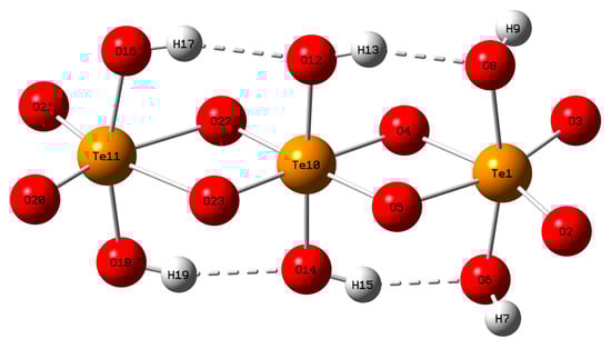 Gaussian09 (Gaussian Inc., Wallingford, CT, USA) was used in all computations [32]. Geometries of the linear and triangular trinuclear anion [Te3O12H6]4− were optimized at the B3LYP/6-311G++(d,p) level using LANL2DZ basis set with effective core potential for Te atoms [33]. The normal-mode analysis did not provide imaginary frequencies for the considered species. The optimized cartesian coordinates of trinuclear anions are presented in Supplementary Materials Tables S1 and S2.