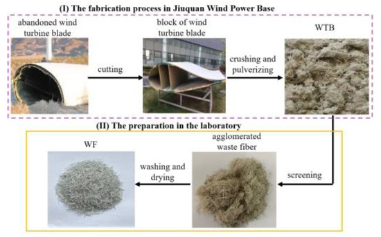 The waste glass fibers were obtained in two steps, as shown in Figure 1. The first step was processed at Jiuquan Wind Power Base. In this step, the abandoned WTB were cut into blocks using a diamond wire saw, which cut peer blocks of about 1 m2. Then, the blocks were shredded, crushed by a crusher, and the fibrous material was pulverized with a grinding mill. (The factory specially customized the machine of the crusher and grinding mill. The equipment had four parts: shredding part, transmission equipment, primary crushing equipment, and vibrating screen.). The high-performance multi-functional grinding mill (XICHU-4500Y, Zhejiang, China) ground the sheets into fibrous materials. The fibrous materials were agglomerated like cotton. The second step was sieving, washing with deionized water to remove the floc, and drying the fibers in an oven at 80 ℃. The final products were the WFs with a length of about 4–9 mm. The length–diameter ratio was not unique.