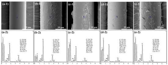 SEM morphology and EDS results of five types of waste glass fibers before and after treatment. (a-1) SEM image of UWF; (a-2) EDS image and the percentages of the elements present in the UWF; (b-1) SEM image of MWF1; (b-2) EDS image and the percentages of the elements present in the MWF1; (c-1) SEM image of MWF2; (c-2)EDS image and the percentages of the elements present in the MWF2; (d-1) SEM image of MWF3; (d-2) EDS image and the percentages of the elements present in the MWF3; (e-1) SEM image of MWF4; (e-2)EDS image and the percentages of the elements present in the MWF4.