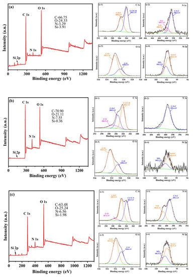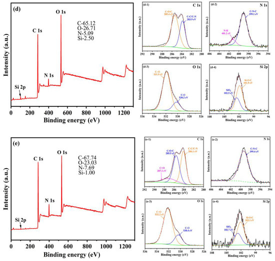 Fully scanned XPS spectra and zoomed spectra of C1s, N1s, O1s, and Si2p. (a-1–a-4) C1s, N1s, O1s, and Si2p spectra of UWF; (b-1–b-4) C1s, N1s, O1s, and Si2p spectra of MWF1; (c-1–c-4) C1s, N1s, O1s, and Si2p spectra of MWF2; (d-1–d-4) C1s, N1s, O1s, and Si2p spectra of MWF3; (e-1–e-4) C1s, N1s, O1s, and Si2p spectra of MWF4.