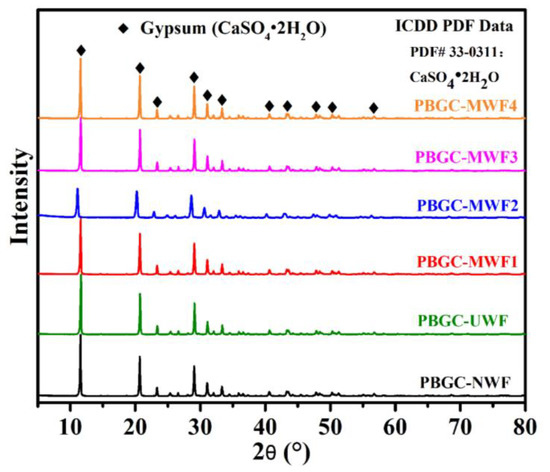 In addition, in Figure 9, it can be observed that there was a distinct boundary between the PBG matrix and the waste glass fibers, implying no chemical reaction occurs between the waste glass fibers and the PBG matrix. To further investigate whether the chemical reaction occurred between the treated fibers and the PBG matrix, XRD was applied to explore the phase structure of the final materials. As demonstrated in Figure 11, the main component of all the PBGCs was CaSO4·2H2O, indicating that the UWF or MWF had not participated in the reaction in the hydration process of gypsum. They only played the role of reinforcement bridges, providing the solid binding force, interface bonding force, and mechanical meshing force.