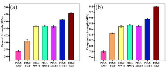 To explore the effect of the MWF dosage on the mechanical properties, the flexural and compressive strengths of the PBGCs with the waste glass fibers dosages of 0.5%, 1%, 1.5%, 2%, and 2.5% were tested, as shown in Figure 13. It can be observed that the flexural and compressive strengths were reinforced with increasing fiber contents from 0.5% to 2%. Taking PBGC-MWF4 as an example, the flexural strengths were increased by 16.01%, 14.95%, 17.15%, 18.67%, and 18.14% with the fiber contents of 0.5%, 1%, 1.5%, 2%, and 2.5%, and the compressive strengths were increased by 6.58%, 5.96%, 6.29%, 11.92%, and 10.08%. The PBGC-MWF4 with 2% dosage exhibited the highest compressive strength of 9.98 MPa and flexural strength of 5.19 MPa. The trend of the PBGC-NGF mechanical properties was shown to be the same as the PBGC-MWF4. In Figure 13, the mechanical properties of the PBGC-NGF are approximately the same as the PBGC-MWF4. Figure 14 reveals the excellent performance of raised MWF4 or new glass fibers, but the dosages of 2% and 2.5% displayed that the flexural and compressive strengths had no significant differences. Figure 12 and Figure 13 proved that the WFs modified by dopamine and benzonitrile work well.