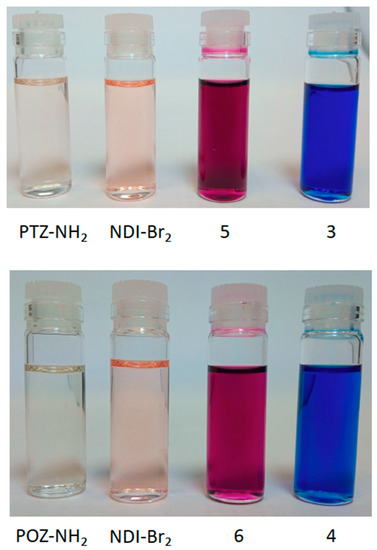 Photographs of CH2Cl2 solutions of the various compounds. Note the pink colour associated with mono-amino substituted NDIs, 5 and 6, and di-amino substituted NDIs, 3 and 4.