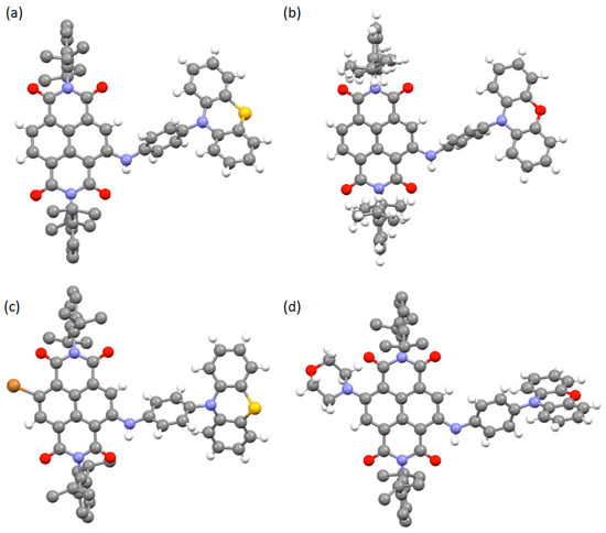 Views of the crystal structures of (a) 1, (b) 2, (c) 5 and (d) 9. Note the similarities in the structures but also the variations in the arrangement of the phenothiazine or phenoxazine appendage with respect to the NDI core, illustrating the flexibility of this arm even in the solid-state. In each case the hydrogen atoms of the N-terminal diisopropylphenyl groups are omitted for clarity. C—grey; H—white; O—red; N—blue; S—yellow; Br—brown.