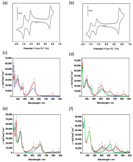 Cyclic voltammograms of (a) 1 and (b) 3 in CH2Cl2 with 0.4 M [NBu4][BF4] as the supporting electrolyte, at a scan rate of 100 mVs−1. UV/vis absorption spectra recorded in CH2Cl2 containing [NBu4][BF4] (0.4 M) using spectroelectrochemical methods for 2 and 3 at 243 K showing the inter-conversion of (c) 2 (blue) to 2+ (red) and (d) of 2 (blue) to 2− (red) to the regenerated species of 2 (green); (e) the inter-conversion of 3 (blue) to 32+ (red) to the regenerated species of 3 (green); (f) the inter-conversion of 3 (blue) to 3− (red) to the regenerated species of 3 (green). Arrows show the progress of (c,e) the oxidation or (d,f) the reduction.