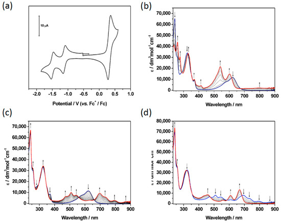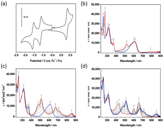 (a) Cyclic voltammogram of 7 and (b–d) UV/vis absorption spectra of 7 recorded in CH2Cl2 containing [NBu4][BF4] (0.4 M) using spectroelectrochemical methods at 243 K showing (b) the inter-conversion of 7 (blue) to 72+ (red); (c) the inter-conversion of 7 (blue) to 7− (red); (d) the inter-conversion of 7− (blue) to 72− (red). Arrows show the progress of (b) the oxidation and (c/d) the reduction.