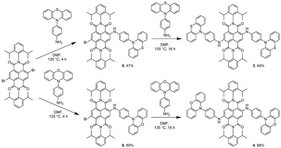 In order to prepare donor–acceptor dyads involving NDI and either phenothiazine or phenoxazine, we reacted the donor phenothiazine or phenoxazine precursors with either mono-brominated NDI (2-bromo-N,N’-bis(2,6-diisopropylphenyl)-1,4,5,8-naphthalenetetracarboxylic diimide) or di-brominated NDI (2,6-dibromo-N,N’-bis(2,6-diisopropylphenyl)-1,4,5,8-naphthalenetetracarboxylic diimide) [2,29]. In the case of the mono-substituted systems, reaction of mono-bromo NDI with either PTZ-NH2 or POZ-NH2 in DMF at 135 °C afforded dyads 1 and 2, respectively (Scheme 2). Formation of 1 or 2 was accompanied by a colour change from beige to pink, indicating the coupling of the amino group with the naphthyl core of the NDI. Triad 3 was initially prepared by reacting di-brominated NDI with PTZ-NH2 (Scheme 3) which gave a mixture of two products: 3 and 5, corresponding to mono- and di-substitution by the amino-phenothiazine appendage, respectively (see Figure 1 for corresponding colour changes). Indeed, the mono-substituted product 5 was heavily favoured with 47% yield, versus 7% of the di-substituted 3, thus providing a pathway to asymmetrically substituted NDI triad systems (see below). We reason that the first amine substitution has a deactivating effect on the naphthyl core through increased electron donation, that reduces the nucleophilicity of the second substitution site [2]. Despite this, 3 can be reasonably prepared by further reaction of 5 and PTZ-NH2 in DMF at 135 °C. A colour change of the reaction mixture from pink to blue indicated the successful addition of the second amine group to the NDI (see Figure 1).