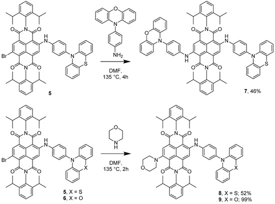 Synthesis of asymmetrically substituted NDI systems. Combining both phenothiazine and phenoxazine appendages (7); and morpholine with either phenothiazine (8) or phenoxazine (9).