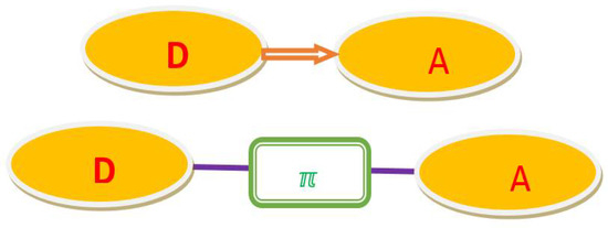 Low band gap materials have attracted the attention of the scientific community because of their high tendency to harvest photons of visible wavelength, redox-tunable quality, and use in ambipolar transistors [27,28,29,30,31,32,33]. Essentially, a promising strategy is to develop molecules that carry electron-donating moiety (D) and electron-acceptor moiety (A) that can match the charge carrier injection and receive both holes and electrons. The most important materials to date have been modifications of the HOMO/LUMO (highest/lowest occupied/unoccupied molecular orbital) of the molecule, which can be obtained by the simple introduction of the suitable D and A units in the molecule [34,35,36]. In such compounds, the interaction of the HOMO, which donates the electron (D), and the LUMO, which accepts the electron (A), results in a narrowing of the gap [37]. At present, HOMO and LUMO molecule levels can be controlled, making those systems more attractive for use in OSMs [38]. The benzothiazole group has been described as a valuable receptor. It provides a D-π-A compound that exhibits two-photon absorption (TPA) compared with asymmetrical chromophores [39]. The donor–acceptor (DA) model system diagram is illustrated in Figure 1. By adopting the benzothiazole unit as a well-made acceptor, the changes made by various donors can further increase the TPA.