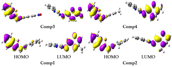 Here, the first λmax band was noticed at 358 nm related to H→L (S0→S1), whereas the second was from H→L + 1 at 281 nm for Comp1 in the gas phase. The first λmax band was observed at 363 nm corresponding to H→ L (S0 → S1), while the second was from H→L + 1 at 281 nm for Comp1 in ethanol. Additionally, no significant effect was observed on λmax from the gas phase to solvent in Comp1, Comp2, and Comp4. The solvent polarity also had no significant effect on λmax. In the gas phase, the substitution of -NO2 at position 5 of furan in Comp3 led to a red shift, i.e., 93 nm in the first band and 42 nm in the second band compared with Comp1. We noted that a significant effect was observed in λmax from the gas phase to solvent in Comp3, i.e., 481 nm in ethanol vs. 451 nm in the gas phase. The computed data were in good agreement with the experimental findings, see Table S1. The substitution of -NO2 at position 5 of furan in Comp3 led to a redshift in λmax from the gas phase to ethanol, acetone, DMF, and DMSO, i.e., 30, 30, 33, and 33 nm for the first band and 12, 12 13, and 13 nm for the second. The effect of electron acceptor and electron donor moiety was mainly on the first λmax band, i.e., the introduction of -NO2 at position 5 of furan in Comp3 tuned the wavelength toward a longer wavelength.