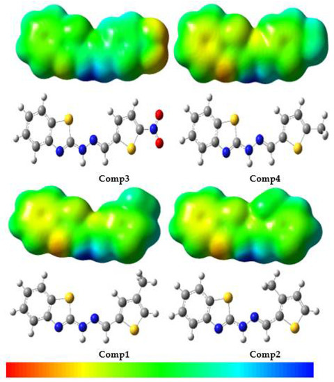 Figure 7 reveals that the nitrogen atom in the benzothiazole moiety, in particular, had negative potential, while -NH on the bridge with the -CH3 group had good positive potential. In Comp3, the -NO2 group had a negative potential. These results clearly indicated that in the event of a nucleophilic attack, the repulsion will be in potentially negative MEP areas, i.e., the benzothiazole moiety, especially the nitrogen atom and the -NO2 group, while the main attraction will be on the -NH and -CH3 groups. In addition, in the event of an electrophilic attack, the attraction may be to the benzothiazole moiety, especially the nitrogen atom and the -NO2 group, while the greater repulsion may be to the atoms in the -NH and the -CH3 groups.