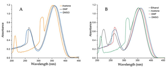 UV–vis spectrum of (A) Comp1 (0.5 × 10−5 M) in DMF and DMSO; (B) Comp2 (0.5 × 10−5 M) in acetone, ethanol, DMF, and DMSO.