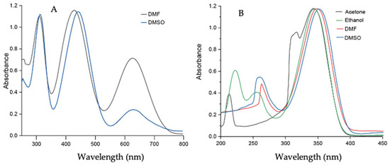 UV–vis spectrum of (A) Comp3 (0.5 × 10−5 M) in DMF and DMSO; (B) Comp4 (0.5 × 10−5 M) in acetone, ethanol, DMF, and DMSO.