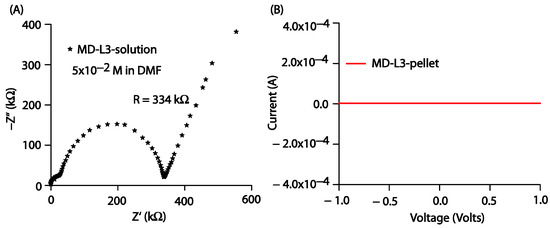 (A) Nyquist impedance plot for Comp2 solution in DMF (5 × 10−2 M), (B) I-V characteristics for Comp2 pellet.