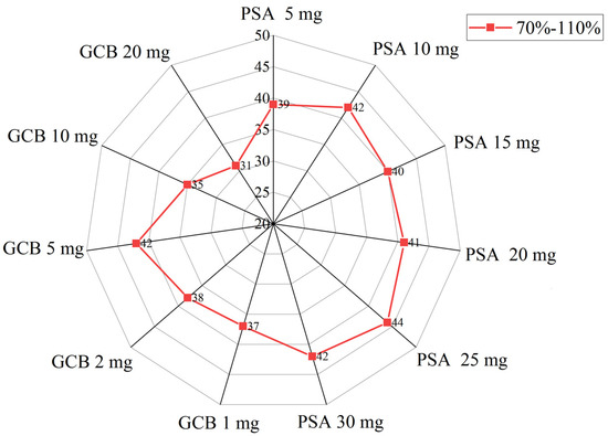 Considering the ingredients of fruits and vegetables, this study selected anhydrous magnesium sulfate (MgSO4), primary secondary amine (PSA) and graphitized carbon black (GCB) as purifiers and optimized their dosage. The experimental results were measured by the number of pesticides whose spiked recoveries of 45 pesticides (the average value of the experiment was repeated three times) were between 70% and 110%. According to previous reports in the literature [13], the influence of the dosage of PSA when the dosage of anhydrous magnesium sulfate was set to150 mg on the purification effect was investigated. Samples of 5, 10, 15, 20, 25, and 30 mg of PSA were added to 1 mL of the extract previously mixed with 20 μg/kg of the target compound. The results (Figure 1) indicated that the recovery rate of each pesticide had little difference with the increase in PSA dosage; when the PSA dosage was greater than 15 mg, the color of the extract gradually became lighter, but there was no obvious difference after the dosage exceeded 25 mg. Therefore, the dosage of PSA was determined to be 25 mg. Under the condition that the dosage of PSA was 25 mg and the dosage of anhydrous magnesium sulfate was 150 mg, the effect of the dosage of GCB on the purification effect was investigated. Samples of 1, 2, 5, 10, and 20 mg of GCB were added to 1 mL of the extract solution in which 20 μg/kg of the target compound was previously added. The results (Figure 1) indicated that the color of the extract became lighter with the increase in the amount of GCB. When the amount of GCB was 5 mg, it was basically colorless and transparent. The recoveries of pesticides with a planar structure similar to GCB, such as emamectin benzoate, acetamiprid, and carbofuran, began to decline. Therefore, the dosage of GCB was determined to be 5 mg. After optimizing the type and content of salt in the salt bag, 25 mg PSA was finally determined, and 5 mg GCB and 150 mg anhydrous MgSO4 can guarantee that the recovery of 45 pesticides greater than 70% can be reached.