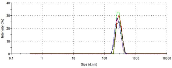 The nanoparticles were obtained by the nanoprecipitation method without adding surfactant. Optimum experimental conditions were as follows: 0.2 g PLA polymer was dissolved in acetone (10 mL) and added to MilliQ water (1v/3v). A white and milky suspension was obtained after the formation of the nanoparticles. The production yield, based on recovered PLA after solvent evaporation, was in the 70−80% range. According to the DLS results, the obtained nanoparticles had a mean hydrodynamic diameter of 287.4 nm (±10); and a polydispersity index (PDI) of 0.14 (±0.06) (Figure 1). This indicates that NP distribution was in a quite narrow range. Zeta potential is one of the important parameters affecting the stability of nanoparticles. Their zeta potential value was −45 mV (±5), prone to ensure colloidal stability through electrostatic repulsion.