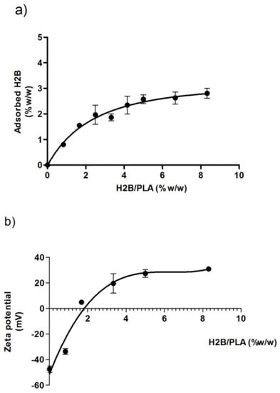 The characteristics of H2B-adsorbed PLA nanoparticles are reported in Figure 3. The NP concentration was fixed at 0.06 w% (i.e., 0.6 mg/mL). The adsorption process was followed by monitoring both the amount of adsorbed protein and the surface charge of H2B/PLA. The maximum adsorption was reached when an introduced protein/particle ratio ranged from 5 to 8.3 w%. Thus, the adsorption capacity was 2.8% w/w of protein particles (Figure 3a). Zeta potentials were followed as a function of introduced protein amounts under the adsorption process, as its strongly cationic character is expected to induce charge inversion (Figure 3b). Flocculation of the colloid was observed around the neutralization point (~2 w% protein/particle ratio). The colloidal stability was restored at an introduced H2B/particle ranging from 5 to 8.3% with a zeta potential of +30 mV and no longer changes, indicating the saturation of the colloid surface.