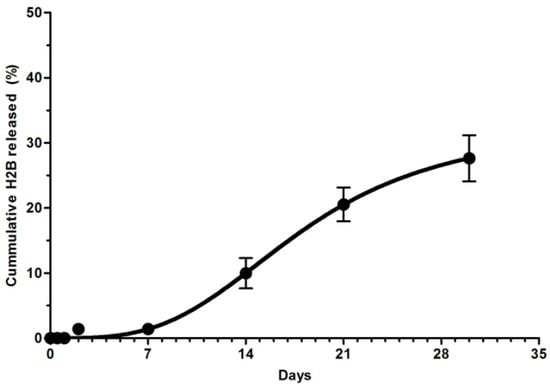 The H2B/PLA-NPs were incubated in PBS buffer (pH 7.4) at 37 °C. The amount of protein in each supernatant was quantified at a fixed time. As shown in Figure 4, protein release followed a specific profile over time. No protein was detected in the supernatant collected during the first three days until day 7. Continuous H2B release was quantified from day 7 to day 21 with a cumulative percentage value of 20%. After that, the release continues to slow down until the end of the test and the maximum percentage value of 30% was obtained (Figure 4).