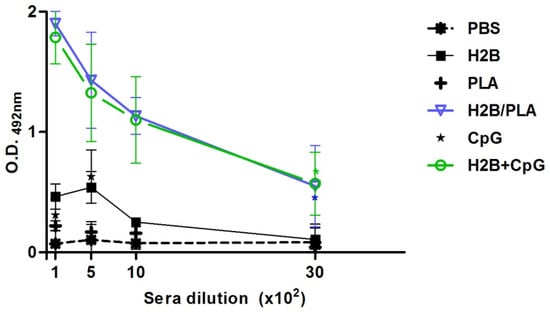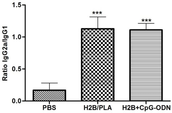 To evaluate the antibody pattern generated based on the H2B/PLA formulation, the IGg1/IgG2 subtype was examined. Enzyme immunoassay (ELISA) was used to detect specific antibodies generated against H2B formulations (H2B/PLA and H2B + CpG7909) in mouse serum. Briefly, 5 µg/mL of H2B was coated in 100 µL of carbonate-bicarbonate buffer (0.1 M) and incubated overnight at 4 °C in 96-well high-binding plates (Nunc). PBS-T20 buffer was used three times to wash the plates. PBS-T20 solution, supplemented with low-fat milk (2%), was used to block the plates at 37 °C for 1 h. After the wash steps, sera were added at a dilution of 1/1000 and incubated for 2 h at 37 °C.