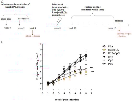 Immune protection of vaccinated BALB/c mice against Leishmania major challenge. (a) The timeline of the in vivo experiment. Female BALB/c mice (6–8 weeks old) were vaccinated twice on day 1 and day 14 with H2B/PLA (25 µg/protein), H2B (25 µg) + CpG or soluble H2B (25 µg). The control groups received PBS, PLANPs or CpG. Mice were infected with (2 × 106) L. major GLC94 promastigotes by subcutaneous injection on the right footpad. (b) Footpad swelling. Lesion sizes were monitored weekly for up to eight weeks. The mean lesion size ± SD is shown (n = 8). (***) p < 0.001 between PBS control and protein-received groups.