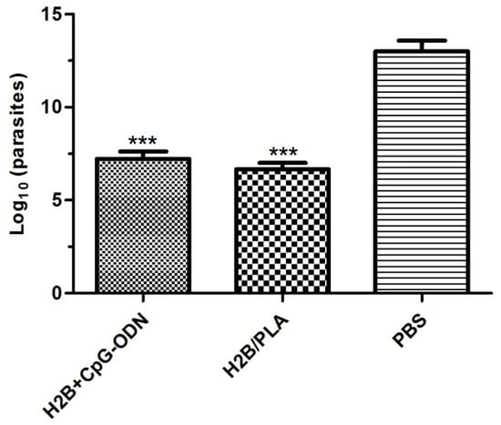 Parasites disseminated in infected footpads were quantified using a limiting dilution technique. As expected, mice immunized with PLA (H2B/PLA) and CpG (H2B + CpG) induced good protection against parasites, with 2–3 log fewer parasites than with the PBS group (p < 0.001). Unvaccinated mice had the highest parasite load (Figure 8). The results correlated with the lesion thickness observed in respective groups. It suggests that only protein formulated with PLA nanoparticles or CpG-ODN can protect animals against parasite spread.