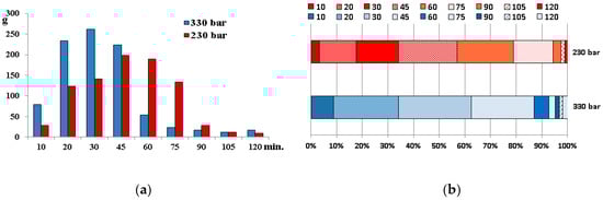 The temperature, time, pressure, and CO2 flow rate are the main factors influencing the effectiveness of supercritical fluid extraction. In our study, the temperature of the extraction was set at 40 °C to avoid degradation of thermolabile components, and the CO2 flow rate was established at the maximal level to accelerate the extraction. The process was conducted using two different pressures: 230 and 330 bars, oil fractions were collected every 10–15 min, and the effectiveness of extraction was assessed. Total extraction yields after 120 min of extraction were 19.67% and 20.94% using CO2 at pressures of 230 and 330 bar, respectively. However, the extraction efficacy and, therefore, the amount of oil extracted in the particular stages varied significantly (Figure 1).