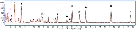 Overlapped BPC chromatograms of extracts obtained using: methanol/water 8:2 v/v (grey line) and water/1,3-propanediol 6:4 v/v (red line). Numbering of components as in Table 5. CR—cyanidin rutoside.