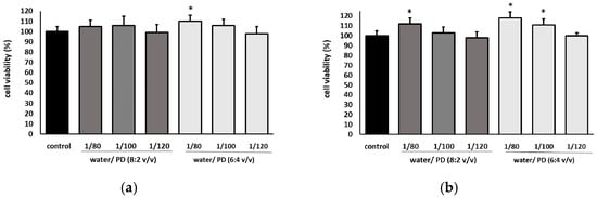 Effect of the different dilutions of water/1,3-propanediol extracts from blackcurrant seed residues on cell viability determined by the NR (a) and MTT (b) assays expressed as a % of control (0.5% of 1,3-propanediol in medium). The data are means ± SD (n = 3). One-way ANOVA followed by Dunnett’s post hoc test was conducted; the differences were considered significant at p ≤ 0.05. * indicates statistically significant difference. PD—1,3-propanediol.