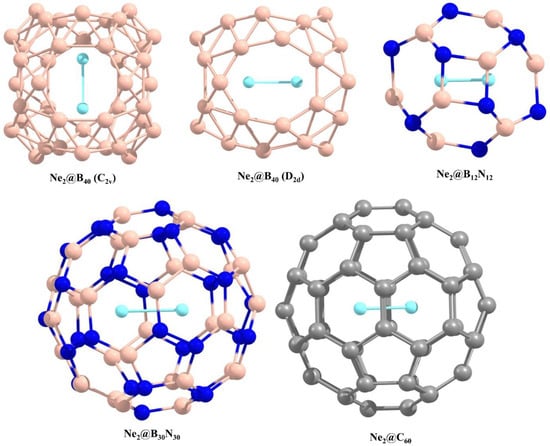 The cages considered for encapsulating neon dimers are the fluxional B40, the non-fluxional B12N12, and the fullerenes C60 and B30N30. The optimized geometries of the encapsulated cage systems are provided in Figure 1. The fluxional borospherene cage has a D2d symmetry with an 1A1 electronic state. The B40 cage has two six-membered and four seven-membered ring structures, the continuous interconversion among which causes its fluxional behaviour akin to that of a nanobubble. On encapsulation of Ne2, two possible geometries can be obtained, one with a C2v symmetry and the other with a D2d symmetry, where the former is marginally more stable. The bond axis of Ne2 is oriented along the imaginary line connecting the midpoints of the two opposing B7 rings in the former case and the B6 rings in the latter case. The formation of both of these Ne2@B40 systems is thermochemically unfavourable (see Table 1); however, once formed, they have kinetic activation barriers high enough to protect from their spontaneous dissociation (~67.5 kcal mol−1 at ωB97X-D/def2-TZVP//ωB97X-D/def2-SVP level) [34]. The distance between the Ne atoms within the cavity reduces from 3.061 to 1.913 Å and to 1.877 Å in the C2v and D2d isomers, respectively. The distortion undergone by the host cage as a result of confining the Ne dimers within it is calculated as 6.395 and 8.106 kcal mol−1 for the C2v and D2d isomers, respectively.