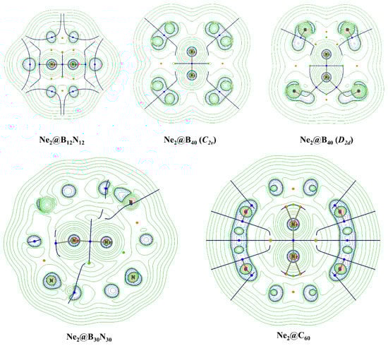 Bader once claimed that the presence of a bond path between two atoms in a molecule in its equilibrium state indicates that there exists a bond between the two [60]. This statement is quite controversial [61,62,63,64,65,66] and is proven not to be true in many cases. We, therefore, rely on the AIM topological analysis to determine the nature of the interaction, rather than claim the presence of a bond just based on the presence of a bond path. Figure 2 depicts the contour diagrams for the Laplacian of the electron density, ∇2ρ(rc), calculated for the Ne2@cage systems. Ne-Ne bond paths are present in all the systems. Six numbers of Ne-N bond paths are detected in the Ne2@B12N12 system, three Ne-N in Ne2@B30N30, six and four Ne-B in the C2v and D2d isomers of Ne2@B40, respectively, and ten Ne-C in Ne2@C60 (see Figure 3). We are interested in the nature of interactions that exists between the two Ne atoms under confinement; thus, we have calculated the relevant topological descriptors, viz., electron density (ρ(rc)), its Laplacian (∇2ρ(rc)), local potential, kinetic, and total energy densities (V(rc), G(rc), and H(rc)), at the bond critical point (BCP) between the said atoms (Table 4). A positive value of the Laplacian of electron density indicates a depletion of the same, suggesting a noncovalent type of interaction. Although it is a necessary criterion, it is not a sufficient one. A positive value of the summation of the local energy densities (i.e., H(rc) = G(rc) + V(rc)) along with positive ∇2ρ(rc) again points towards the nature of interaction being a non-covalent one [67]. In our cases, the H(rc) values are positive, but their values are so small (pretty close to zero) that they may change their sign in case we try different levels of theory and stroke all basis sets. It may be noted that for the dimers of larger Ng atoms such as Kr2 and Ar2, negative H(rc) values are obtained [34]. This means that a partial covalent bond exists in those two dimers. It follows the prognosis made by Linus Pauling that it is possible for heavier Ng atoms to form bonds owing to the fact that they contain loosely bound electrons [68]. The magnitude of ρ(rc), ∇2ρ(rc), G(rc) and V(rc) gradually decreases with the increase in the size of the cage, whereas H(rc) increases. The ratio −G(rc)/V(rc) > 1 in all the systems suggests a purely non-covalent interaction between the Ne atoms [69]. Again, the ratio of G(rc) to ρ(rc) provides an insight into the type of interaction: greater than 1 suggests the absence of any covalent interactions. It has earlier been reported that in the B12N12 cage, some degree of covalent character can be induced between two He atoms [32,70]. Thus, this interesting behaviour of developing partial covalent bonding interaction can be investigated for heavier noble gas dimers as well by subjecting them to a similar degree of confinement. Of course, that would require increasing size of cages for increasing size of the noble gas elements.