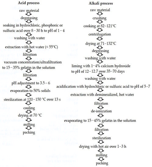Flow diagram of acid and alkali process of gelatin production. Own figure based on Ref. [146]. 2022, Wasswa et al.