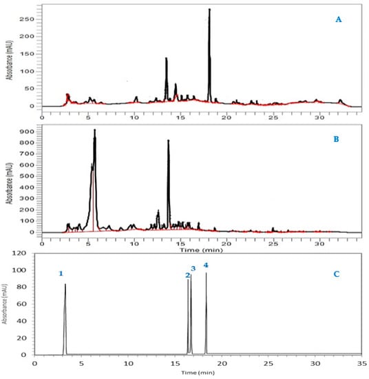 HPLC-DAD chromatogram of Solanum elaeagnifolium hydroethanolic extracts at 280 nm (leaves (A) and fruit (B)) and standards (C) (luteolin (1), quercetin (2), gallic acid (3), and naringenin (4)).