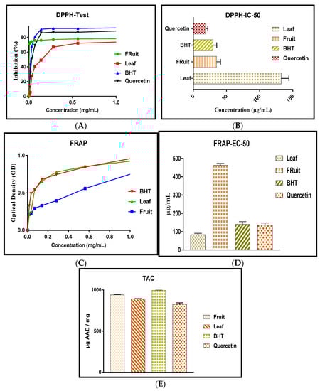 Antioxidant capacity assessed by the DPPH method: dose–effect curves (A) and IC50 (B). Antioxidant power assessed by the FRAP method (C) and EC50 (D). Total antioxidant capacity assessed by the phosphomolybdate method (E).