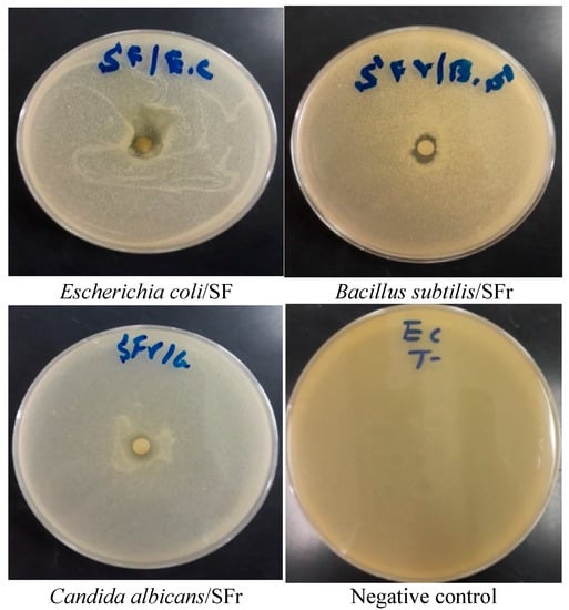 The MICs of SFr and SF against four bacteria and C.albicans were determined as previously described []. In summary, the microplaque was prepared in aseptic conditions; a volume of 100 μL of SFr and SF with a dilution of 1:5 (v/v) was pipetted into the first column of the plaque, before 50 μL of MH or ME was added. Next, serial dilutions were performed by use of two-fold dilution. After 1 day post-inoculation for bacteria and 2 days post-inoculation for C. albicans, MICs were determined by using the colorimetric method (TTC 0.2% (p/v)) [,].