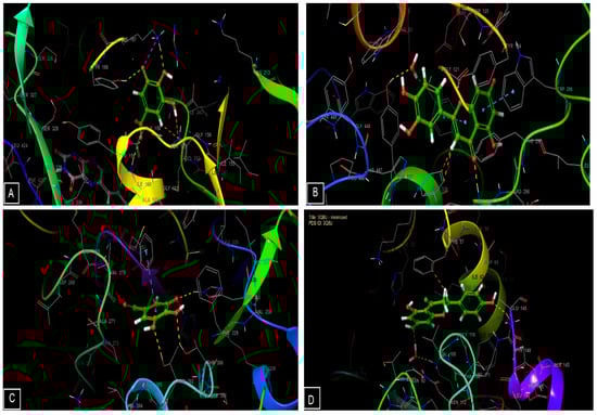 Three-dimensional (3D) view of ligands’ interaction with active sites: (A) interactions between gallic acid and the 2CDU active site; (B) interactions between luteolin and the 4EY7 active site; (C) interactions between the active site of 1FJ4 and gallic acid; (D) interactions between the active site of 3Q8U and naringenin.