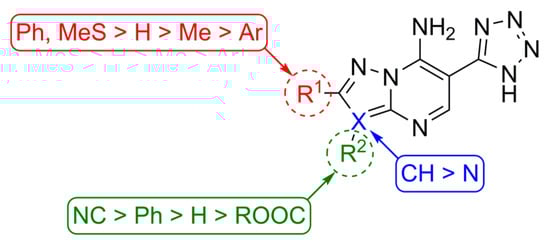 At the same time, a nitro group or carboxylic fragment should present within heterocyclic scaffold for this useful activity to be formed (Figure 2). On the other hand, the tetrazole cycle is a metabolically stable bio-isostere of the carboxyl group and the cis-amide fragment due to the similar electronic structure [,,,,]. The corresponding similarity for the carboxylic anion and the nitro group can be noted and one can consider the tetrazolyl fragment as an isostere for both of them (Figure 3a). However, only one example of azoloazines containing tetrazole cycle has been published to date—2-nitro-6-(1H-tetrazol-5-yl)-[1,2,4]triazolo[1,5-a]pyrimidin-7-amine was considered as nitrogen-rich energetic material [].