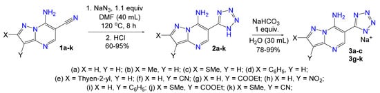Scope of 6-(tetrazol-5-yl)-7-aminopyrazolo[1,5-a]pyrimidines 2a–k and corresponding sodium salts 3a–c, 3g–k.