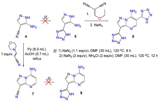 The cycloaddition of sodium azide to the C6-nitrile fragment in this series 1a–k proceeded without competing processes. Thus, in the case of dinitriles 1f and 1k it was observed that only one cyano group reacted with azide to form tetrazole cycle as there were CN characteristic absorption peaks in the region of 2217–2231 cm−1 in IR spectra of the obtained products 2f and 2k. The same results were obtained in the reaction of 1f and 1k with 3 equiv. of sodium azide by the analysis of reaction products with 1H and IR spectroscopy. We have tried to obtain 3,6-di(tetrazol-5-yl)pyrazolopyrimidine 6 by independent synthesis via two steps starting from 3-amino-4-cyanopyrazole 4 (Scheme 3). It was showed that the heating of compound 4 with sodium azide in DMF both with ammonium chloride and in the absence of it did not lead to tetrazolyl heterocycle 5. Subsequently, pyrazole 4 has been converted to 3-cyano-7-aminopyrazolopyrimidine 7 [], but the latter also did not react with sodium azide under different conditions and starting material 7 was isolated after workup of the reaction mixture (Scheme 3). These findings support regioselectivity of the azide-nitrile cycloaddition process in the series of 3,6-dicyanopyrazolopyrimidines as only nitrile group in the pyrimidine ring converts into tetrazole fragment.