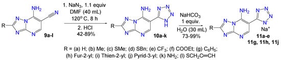 The azide-nitrile cycloaddition proceeded smoothly in the case of [1,2,4]-triazolo[1,5-a]pyrimidines 9a–k under optimized conditions and resulted in a series of 2-R-6-(tetrazol-5-yl)-7-amino[1,2,4]triazolo[1,5-a]pyrimidines 10a–k with good yields (42–89%) (Scheme 4). The unidentified oily products were isolated when thiopropargyl containing derivative 9l was introduced in the reaction, probably due to the side azide-alkyne cycloaddition to form 1,2,3-triazole.