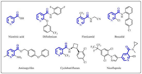 Natural products bring bioinspiration to laboratories for the discovery of new weeds, plant pathogens and insect pest control agents, and they play an important role in the advancement of crop protection research [5,6,7,8,9]. Heterocycles are present in a large proportion of natural molecules and often contribute significantly to their structural and physical properties as well as to their biological activity [10,11,12,13]. Approximately 70% of all the agrochemicals that have been launched within the last 20 years bear at least one heterocyclic ring [14]. The nitrogen-containing heterocycle in the natural molecule nicotinic acid, vitamin B3, is the first lipid-lowering drug used for dyslipidemia treatment, and it has been applied for more than five decades [15]. Nicotinic acid and its derivatives play crucial roles as multifunctional pharmacophores in governing many biological activities related to physiological functions and pharmacological activities [16]. In agriculture, nicotinic acid derivatives display extensive applications as well. Agrochemicals, such as diflufenican as a herbicide, flonicamid as an insecticide and boscalid as a fungicide, have already been widely used for crop protection [17,18,19]. Currently, a few new nicotinic acid derivatives have been discovered and are under development as agrochemical candidates, for example, aminopyrifen as a fungicide candidate, cyclobutrifluram as a fungicide–nematicide candidate and nicofluprole as an insecticide candidate (Figure 1) [20,21,22]. Multidisciplinary interest has been focused on the study of nicotinic acid and its derivatives.