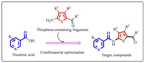 Obviously, based on the modification of natural products and the active substructure splicing method, combinations of the two active substructures of nicotinic acid and thiophene are significant for the discovery of agricultural fungicides with novel molecular structures. A series of N-(thiophen-2-yl) nicotinamide derivatives were designed to generate novel compounds with excellent fungicidal activity (Scheme 1).