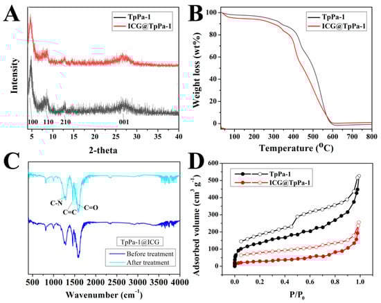 PXRD patterns (A) and TGA curves (B) of TpPa−1 and TpPa−1@ICG. FT-IR spectra (C) of TpPa−1@ICG before and after treatment. N2 adsorption–desorption isotherms (D) of TpPa-1 and TpPa−1@ICG.