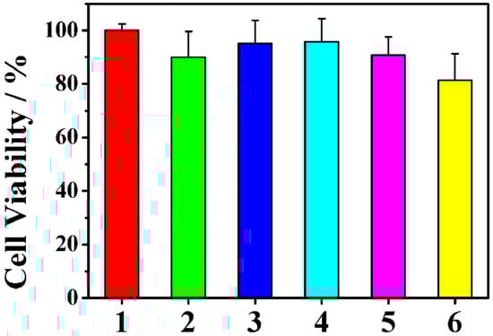 The cell toxicity of ICG, TpPa-1@ICG and different concentrations of TpPa-1@ICG-HG co-incubated with RAW cells for 24 h. Each experiment had been repeated three times. Error bars indicate ± s.d. 1: control (RAW cells only); 2: add 0.1 mg/mL ICG; 3: add 0.1 mg/mL TpPa-1@ICG; 4: add 0.1 mg/mL TpPa-1@ICG-HG; 5: add 1.0 mg/mL TpPa-1@ICG-HG; 6: add 2.0 mg/mL TpPa-1@ICG-HG.